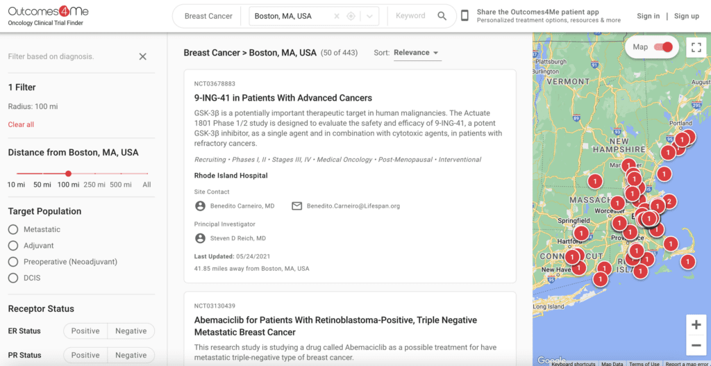 Today, we are rolling out The Outcomes4Me Oncology Clinical Trial Finder, a free desktop and mobile web app developed to aid oncologists and patients to quickly find appropriate clinical trials. In this first version, we are focused on breast cancer and created an experience that understands the nuances of the disease. For example, a premenopausal woman is eligible for postmenopausal trials because she can be given drugs that can induce menopause.